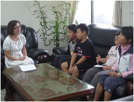 午休時我們一行人前往校長室,準備好攝影器材和背好稿子,心情很緊張!我是負責訪問的小記者,輪到我講題目時,雖然緊張,但我慢慢的講出題目,幸好沒有講錯,講完題目後就專心的聽校長的回答,雖然有帶筆,但忙得沒空記。講完後,校長還請我們喝茶,讓我們非常開心!~柏瑞~
