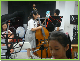 約定的時間到來,我們興高采烈的走進國樂團教室。過程中辜團長一一為我們說明,有時不僅請團員示範,更親自彈奏起樂器,讓能親眼目睹樂器的我們大開眼界,而且午休時間,教室裡各角落不時傳來音樂聲,可見團員們平日的練習是多麼扎實,真令我們佩服! |