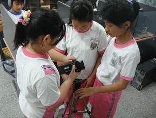 今天老師帶著腳架、攝影機和數位相機,讓我們練習架設腳架、操作攝影機和拍照。老師先示範一次,再讓我們各組練習,操作過後我們知道了怎麼組裝腳架跟攝影機,其中比較困難的是腳架底盤裝在攝影機後,再將整個組裝到腳架上,這時常出現鏡頭裝反,真奇怪!然後,我們開始練習採訪時的對話。