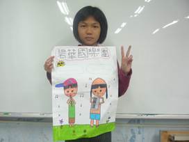 老師叫我們畫關於碧華國樂團的樂器、介紹和背景,要先畫草稿,我畫的是兩個人在吹樂器,第一個在吹直笛,第二個在吹口風琴,我還有畫他們正站在草地上吹著樂器,背景天空中有太陽和雲,草地上也加上很多的小花。