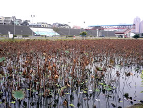 | 荷花主要在夏季開花, 所以冬季的時候, 這裡只剩下一堆枯葉以及蓮蓬 |