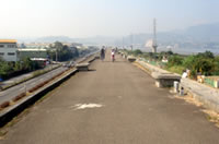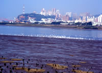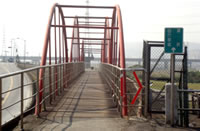 好不容易上了堤防, 總算鬆了一口氣, 不太會騎腳踏車的同學, 也終於可以放心地在這裡踩著踏板, 享受堤防上吹來的陣陣涼風。這裡的堤防很寬敞, 路也很直, 堤防下面有人在玩遙控飛機, 也有不少菜圃。順著堤防前進, 右邊就是淡水河;再往前走一些, 我們就可以看到淡水河的出海口, 這裡有很多白鷺鷥, 也有很多水筆仔, 同時也是我們這條堤防的終點。在這裡, 有一座造型特別的小小關渡橋, 橋下這一大片濕地, 就是生態公園, 經過了這座小關渡橋後, 往右邊走是八里水岸自行車道, 往左邊穿過涵洞後, 則是我們要造訪的對象─「二重環狀自行車步道」。
