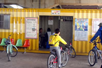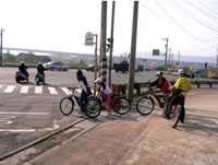 在學校, 我們的心情很緊張, 簡單檢查好裝備後, 大家就都懷著既興奮又不安的心情出發。沒想到, 才一出校門, 問題就來了…天呀!有同學不太會騎腳踏車!不太會騎腳踏車居然還偽裝, 跟著我們一起出任務, 所以在還沒上堤防的這一小段市區道路, 我們只好用牽的!