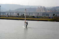 而在生態公園旁邊的景點, 就是鼎鼎大名的「微風運河」了。早在資料蒐集的時候, 我們就知道這裡的活動很多, 而且風景也很美, 來到這裡, 果然名不虛傳, 跟資料上寫的一模一樣喔!這裡的空間很大, 視野很好, 有很多人在這兒釣魚、玩水上活動, 坐在人工湖畔, 好舒服啊!另外, 我們還看到了一旁有貨櫃屋, 所以就過去跟裡面的伯伯聊天, 才知道原來他們是台北縣帆船協會的人, 因為有跟政府配合合作, 所以每週六、日會提供免費的獨木舟課程讓來這裡的遊客體驗, 要不是有任務在身, 我們也好想報名試一試呢!微風運河這個點很不錯, 我們都對它印象很深刻!