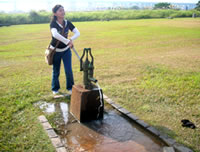 不過在經過一大片的蘆堤公園後, 我們似乎有點迷路了, 因為前方的自行車道居然出現紅綠燈, 在等待紅綠燈的時候, 我們一直猜想到底哪裡才是正確的前進道路, 還好問了路人, 我們才能找到下一個景點──沼澤公園。但是沼澤公園的標示不明, 我們都不太清楚來到沼澤公園該如何進行觀察?要觀察什麼?只知道這裡可能有一些特殊的生態存在, 所以我們也沒多作停留, 簡單繞個一圈, 並小玩了一下壓水器後, 就趕緊趕到下一個比較吸引我們的景點。
