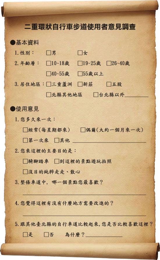 本研究問卷內容包含兩個部份:第一部分是基本資料, 包括年齡、性別、居住地等;另外一部分則是遊客意見, 用來了解遊客對整條車道的感受與意見。因為擔心浪費遊客太多時間, 所以填答的答案大部分都是用勾選的, 只有少數2、3題有開放的答案。問卷內容大致如下: