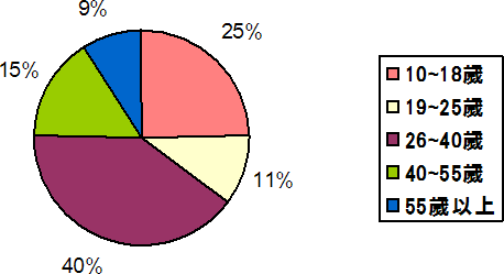我們將年齡層區分為五個區塊。由資料顯示26~40歲的遊客人數最多, 其次是10~18歲的遊客, 但因為這個年齡層的遊客年紀較輕, 比較不可能單獨前往, 所以我們推論10~18歲的遊客大部份是由父母帶至此地遊玩, 而人數最少的則為55歲以上的遊客。這樣的資料顯示, 二重環狀自行車道的景點設施可能比較適合年輕族群。