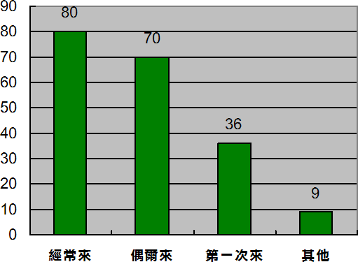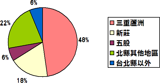 由圖表我們可以看出, 造訪這裡遊客大部分以居住在三重蘆洲地區的民眾最多, 加上鄰近的新莊、五股地區遊客, 人數已達總人數的2/3以上, 顯示可能由於地緣之便, 所以容易吸引附近民眾前來。