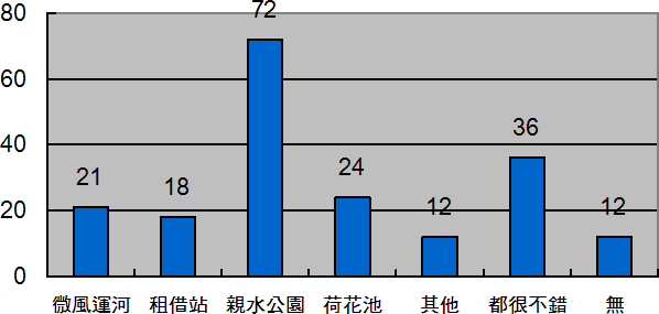 從統計圖中我們可以很明顯的看出, 大部份遊客最喜歡的景點是親水公園, 其次則是荷花池與微風運河。這三個景點有共通的特性, 就是他們的交通比較便利, 遊客比較容易到達, 因此遊客可能較常前往, 自然就成為了他們最喜歡的景點。除此之外, 租借站也是不錯的選擇, 因為租了腳踏車之後, 可以就近在附近騎乘。而有一些遊客認為:淡水河岸邊、兒童遊樂設施區、運動場、生態公園等是最喜歡的景點, 但是因為這些答案的人數不多, 所以我們將它歸納為其他, 另外, 也有18%以上的民眾覺得這裡的景點他們都很喜歡。由此可知, 二重環狀自行車道的景點豐富, 大部分都深受遊客喜愛, 但是交通的便利性會影響遊客對地方的觀感, 更能左右觀光區的人潮多寡, 所以開發建設時, 交通是一項很重要的因素。