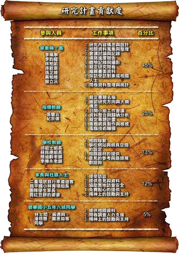 一件任務的完成絕非單一團隊的力量,有更多是來自外界的幫忙。感謝這次專題研究中提供協助的所有人,也感謝學生家長與熱心配合訪談的自行車道遊客,因為大家的參與及默默付出,成就了此次任務,也讓我們的研究更為周詳。「單車嗨!客」團隊,在此對提供協助的每位人士,致上最高敬意。