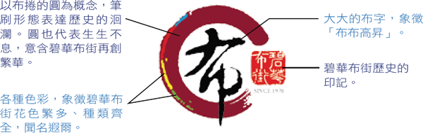 三重碧華街於民國60年左右成形,當時主要經營庫存布、平織布、羅紋布及針織布的生意。民國96年,為了形塑碧華布街整體商圈印象,舉辦「布街Logo徴選」,最後勝出者為下圖,其象徵意義重大。