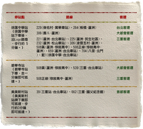 - 捷運:搭乘台北捷運橘線(蘆洲支線)至捷運徐匯中學站(預計99年12月通車)下車,步行至碧華街約5分鐘。