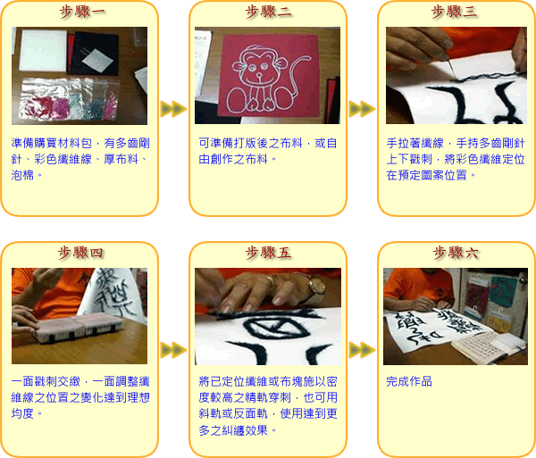 現場提供精緻圖案的布匹、或者素面布匹讓民眾在上面自由創作圖案,接著使用針線的交織來完成圖案,可作為手絹、也可裱框當畫作。