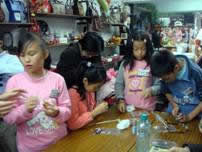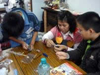 接著是要「餵飽」我們的貓頭鷹,大家盡情的撕棉花、塞棉花,再用竹筷拼命的壓,結果有人的又圓又胖,有人的則較瘦較高。值得一提的是,因為有用針固定一角,但塞棉花時太忘我了,有人就一直被針刺到而哇哇大叫。