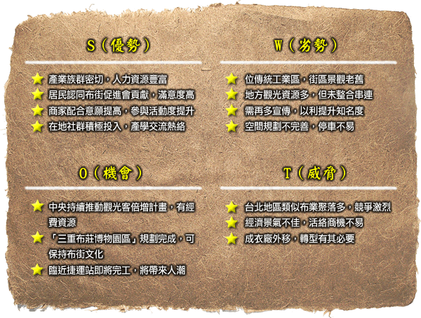 我們透過訪談人物與蒐集資料,對布街促進會有了進一步的了解,更經由問卷調查得知其他訊息,在此以SWOT表為所研究的對象-「三重市布街商街促進會」進行分析,整理如下表: