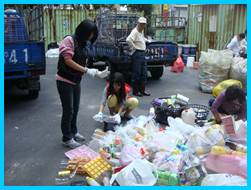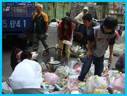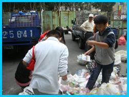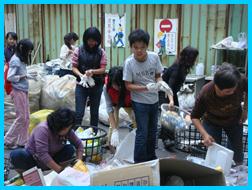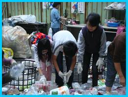 兩點半一到,我們就出發去仁華里資源回站的地方,發現一輛輛的資源回收車進來,把一大堆需要我們回收的回收物倒下來,之後我們也就要幫忙啦!我幫忙的是幫牛奶瓶穿耳洞,咦~為什麼要穿耳洞呀?因為大量的牛奶瓶會很浪費垃圾袋,瓶子大又胖,所以如果把經費花在垃圾袋上那不是很浪費嗎?所以聰明的里長以及志工隊就把一條條的繩子串在瓶子的耳朵上,這一來就可以減少垃圾袋的使用次數(真是聰明耶!)結果到了一個階段的時候,聽到有人說他撿到一些特別的東西,當時我聽到後覺得:怎麼幸運的東西都不撿到,反而不幸運的東西一直撿到,真是…雖然流了整身的汗,但做了那麼多有意義的事,流下的汗也是值得的。 |