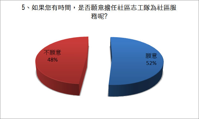 - 可能服務時間為平日上班時間,或受訪民眾多其他里里民,所以對志工隊較陌生。