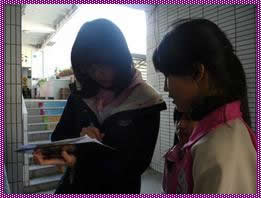 12月25日校慶當天,老師要我們一人拿20張問卷去發,班上的同學黃玉萱、葉芷晴十分熱心的陪我一起去發問卷,一開始我們就勢如破竹的在十分鐘之內就發出了好幾張問卷,才九點半我們就全部發完了,我想應該是我們笑容可掬、人見人愛吧!