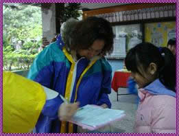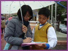 我在發問卷時,老師說一人20張,出發時我只有自己一人,其他人都有伴。我鼓起勇氣要拿給來賓寫的時候,他們都說不要,後來我請某一間安親班的老師寫,他卻叫我也要幫他填安親班的手冊,我為了要完成工作所以我只好填了。因為太多問卷了,所以我只好找其他人一起幫我,最後總算發完了。這個發問卷的活動讓我覺得我們就像校門口那些給我們參考國語日報的大哥哥們,真的好辛苦喔!