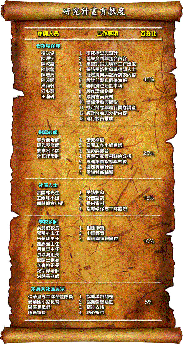 這一項任務的完成並非只有我們團隊的力量,還有來自外界的協助與指導。感謝這次研究中提供協助的所有人,因為大家的參與及付出,才能成就此次任務,也讓我們的研究得以圓滿結束。「碧綠環保隊」成員們,在此對熱心協助的每位人士,致上十二萬分的謝意與敬意。