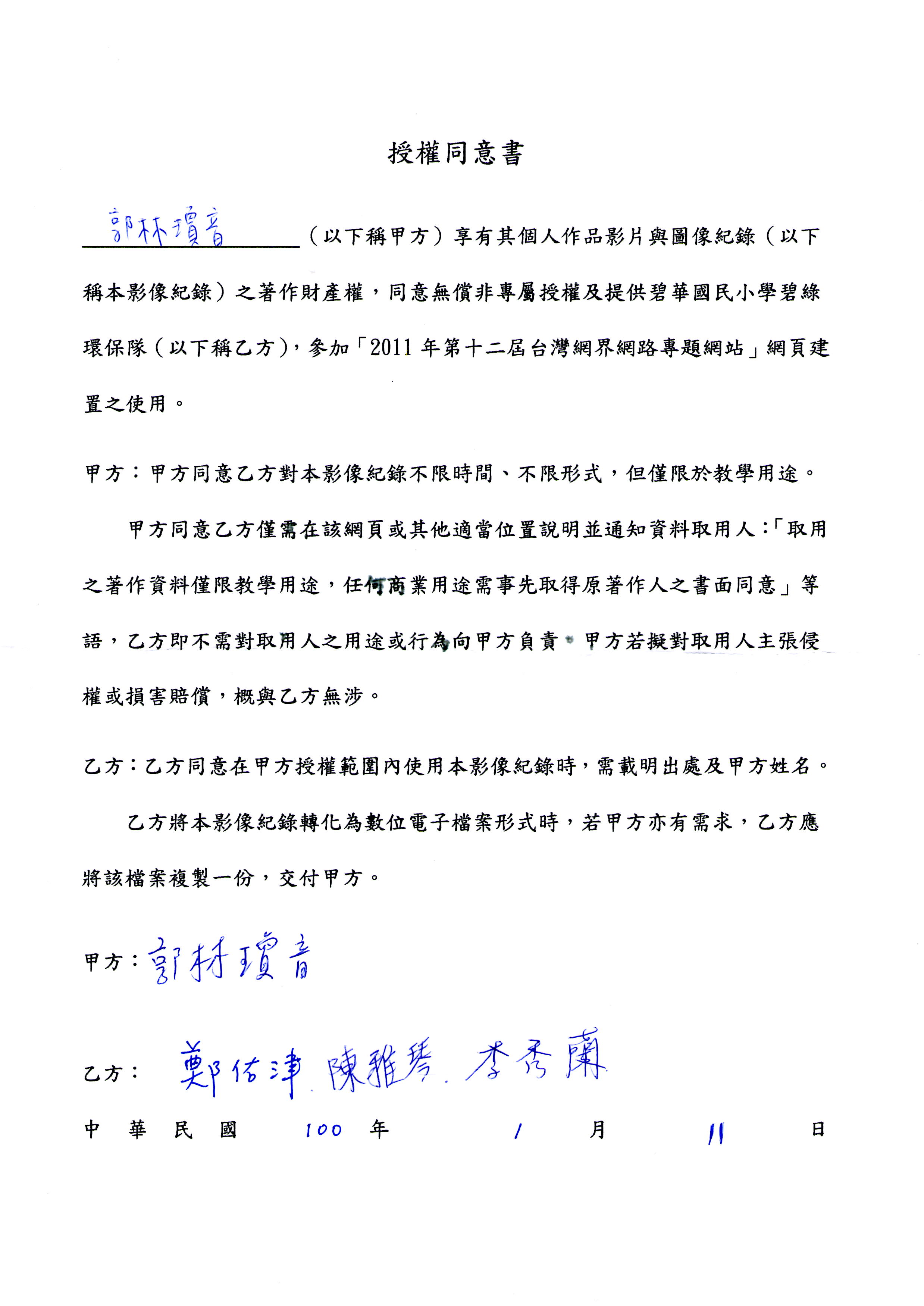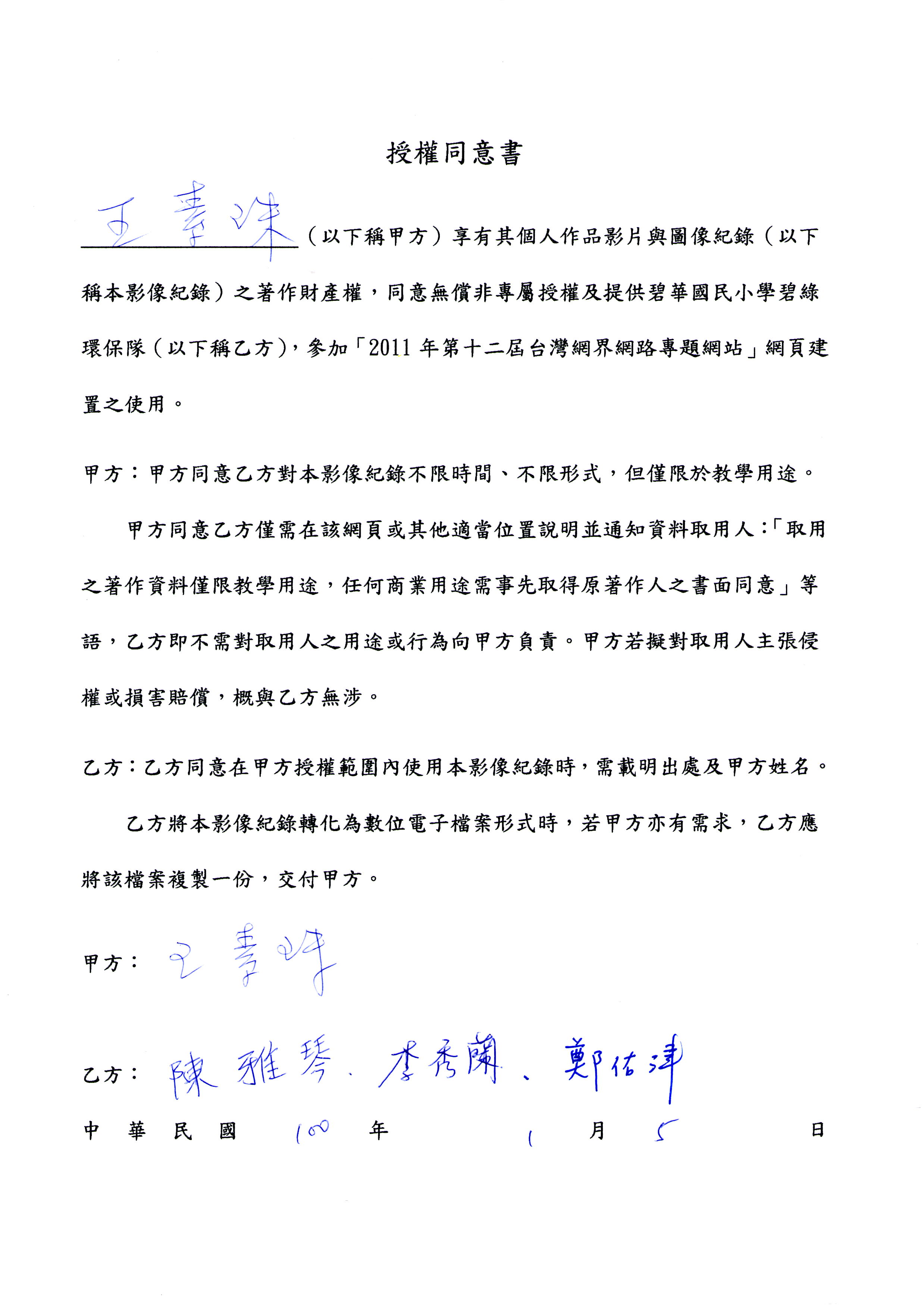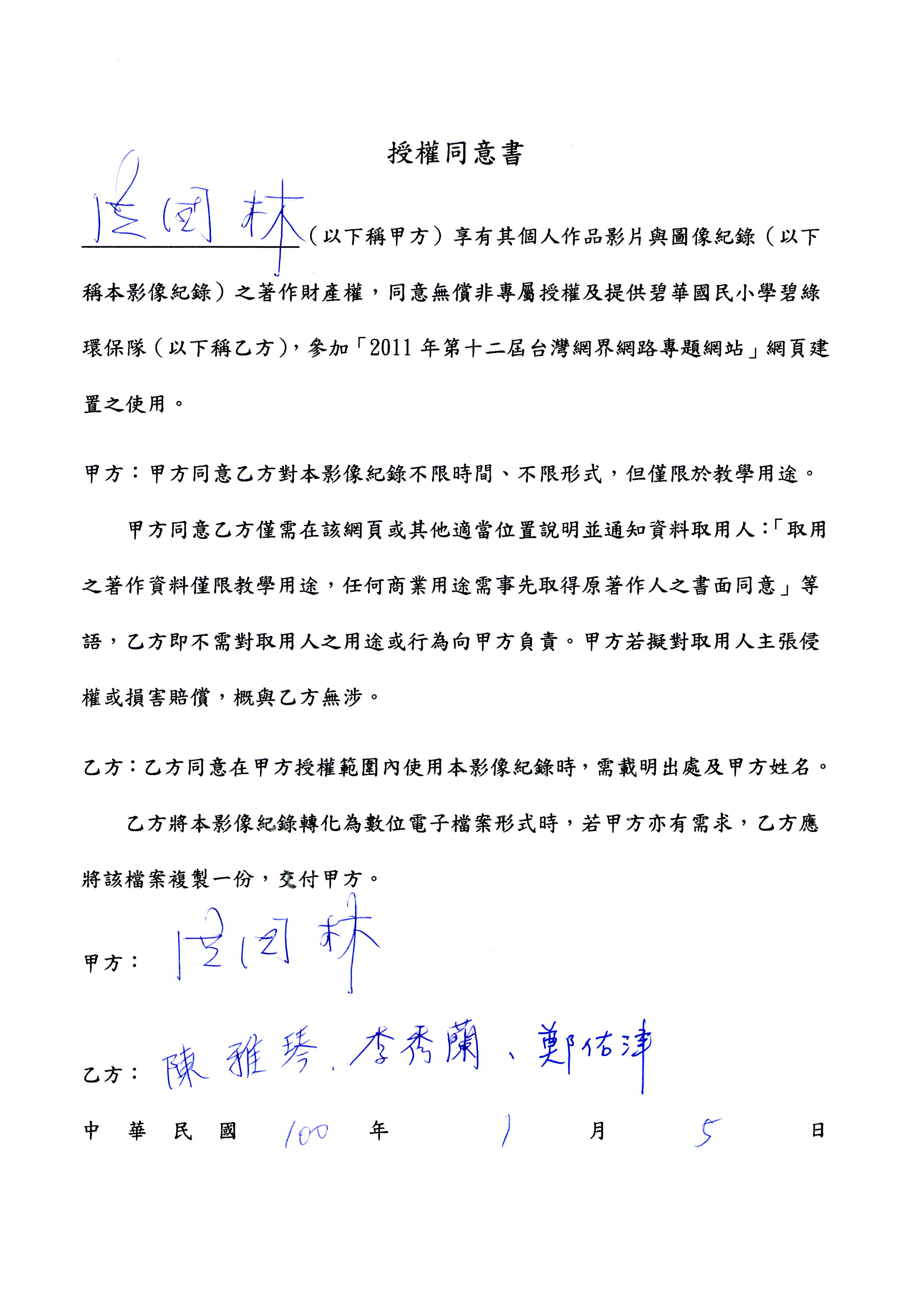 - 本網站【保地勇者,橫掃千軍-仁里志工隊】網頁內容大多由2011臺灣學校網界博覽會碧華國小參賽隊伍 ─「碧綠環保隊」整理撰寫完成。若引用資料亦會於該網頁註明。