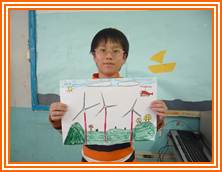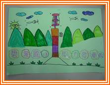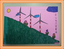 我們開始動手畫,我的圖畫中背景是山,然後還有小涼亭、池塘、太陽、山和幾朵小雲,我草稿好了之後,就用細的奇異筆描邊,我花了兩次上課的時間才上好色,雖然我畫的風力發電機沒別人畫的好,不過我也是花了很多心思呢!